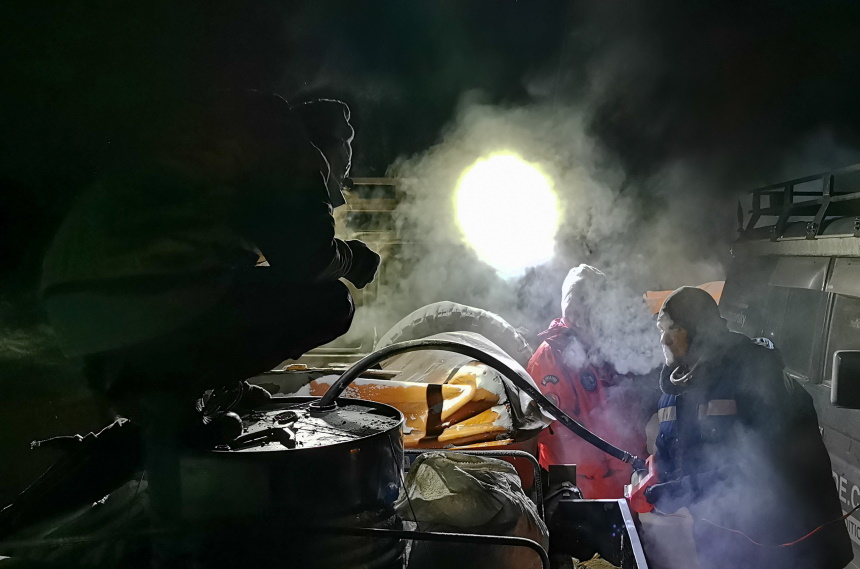 До г. Билибино добираемся к 14-30, пока магазин, заправка (кстати цена на дизтопливо на Чукотке фиксированная — 58 руб./литр), кафе, где нас угостили соленым китовым салом – мантак, и безуспешная попытка попасть на АЭС, время идёт. В итоге необъяснимый билибинский феномен — найти выезд на зимник в сторону Певека, превращается в настоящий квест с непролазными дорогами со старыми советскими табличками со словом «зимник», поисками пути и полным отсутствием нормальных живых указателей до Певека, в результате выезжаем в нужном направлении 12 марта в 18-55, а впереди еще почти 500 км. Надо отдать должное нашим главным рулевым — Дмитрию Сергеевичу и Игорю Николаевичу, они последние 3 суток спали по 3-4 часа, но держались лучше всех и несмотря ни на что, вели авто к намеченной цели. Вообще мы на тот момент догадывались, но не до конца осознавали насколько нам повезло с погодой, не было ни ветра ни снега, а это как мы знаем теперь — решающий фактор!!! Уж если задует, то неизвестно насколько, говорят неделю может дуть, переметы и сугробы образуются буквально на глазах, и там где пару часов назад была дорога, сегодня буксуют мощные полноприводные грузовики.